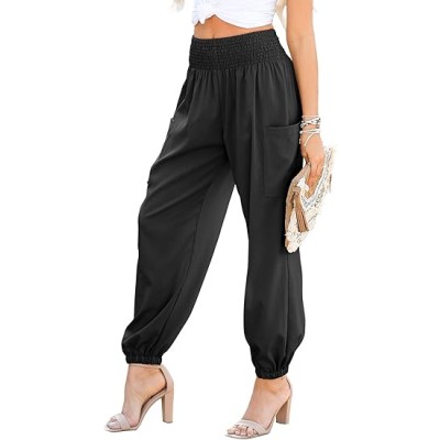 Womens Summer Boho Business Casual Smocked 2025 High Waisted Cargo Summer Long Elephant Pants with Pockets