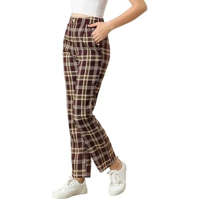 Women's Plaid Pants Elastic Waist Casual Work Office Long Trousers
